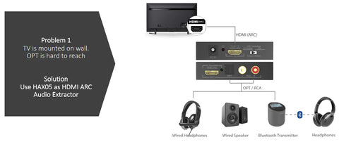 Erstens kann der HAX05 als HDMI ARC Audio Extractor dienen. Der HAX05 extrahiert das Audiosignal vom HDMI-Anschluss Ihres Fernsehers und wandelt es in einen optischen oder RCA-Ausgang um. Dies ist nützlich, wenn Ihr Fernseher an der Wand montiert ist und der optische/Kopfhöreranschluss schwer zu erreichen ist. Sie können den HAX05 an den HDMI-Anschluss Ihres Fernsehers anschließen und voilà! Jetzt stehen Ihnen optische und RCA-Anschlüsse zur Verwendung mit Ihren anderen Audiogeräten zur Verfügung.