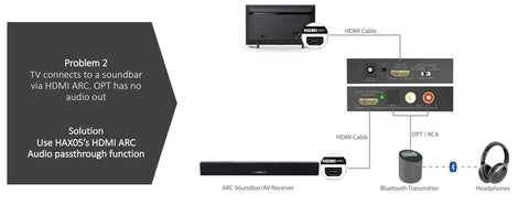 Wenn Ihr Fernseher an der Wand montiert ist und Ihre Audioanschlüsse schwer zu erreichen sind oder Sie einen Fernseher nur mit HDMI ARC und keinen anderen Audioausgängen haben, kann der HAX05 Ihrem Fernseher optische und RCA-Anschlüsse hinzufügen! Wenn Sie eine HDMI ARC-Soundbar verwenden und über Ihre anderen Geräte keinen Ton empfangen, können Sie dieses Problem mit der Pass-Through-Funktion des HAX05 beheben.