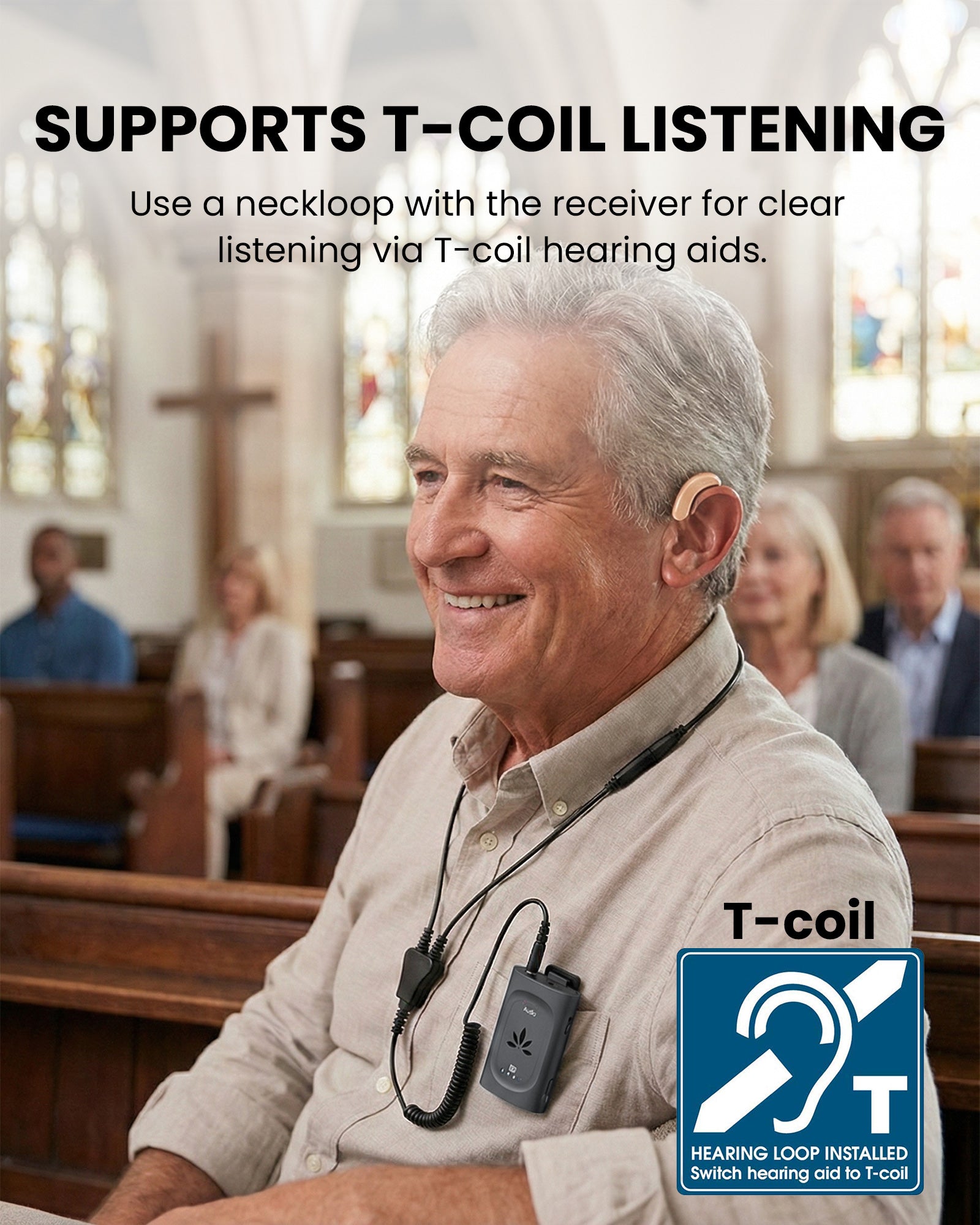 A: Yes. If the church offers Auracast audio, AuraClip lets you listen clearly anywhere in the room, even from the back rows, without pairing or special setup.