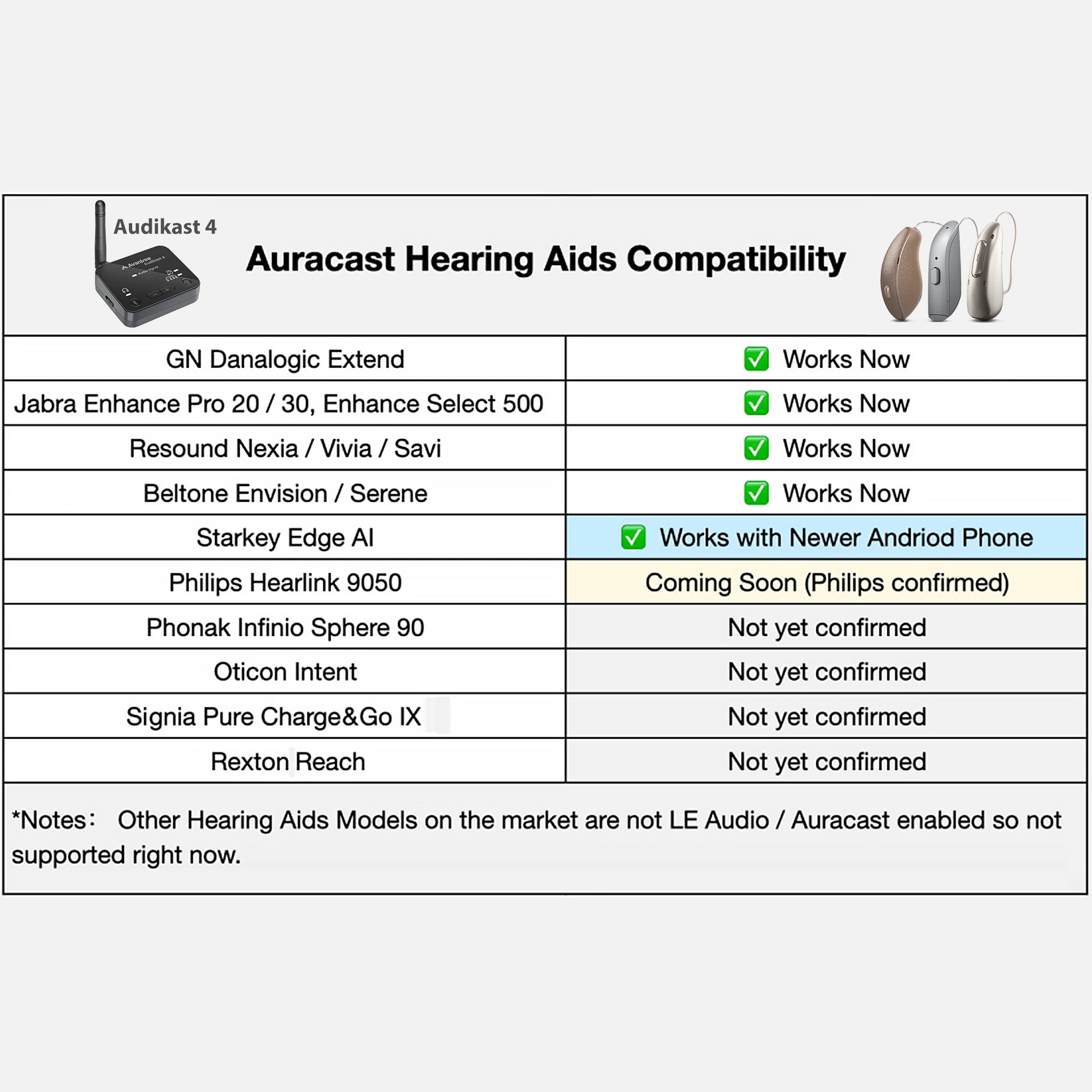 Yes—if your hearing aids support Auracast. Confirmed models include: GN Danalogic Extend, Jabra Enhance Pro 20/30 & Enhance Select 500, ReSound Nexia/Vivia/Savi, Beltone Envision/Serene, and Starkey Edge AI (with newer Android phones).