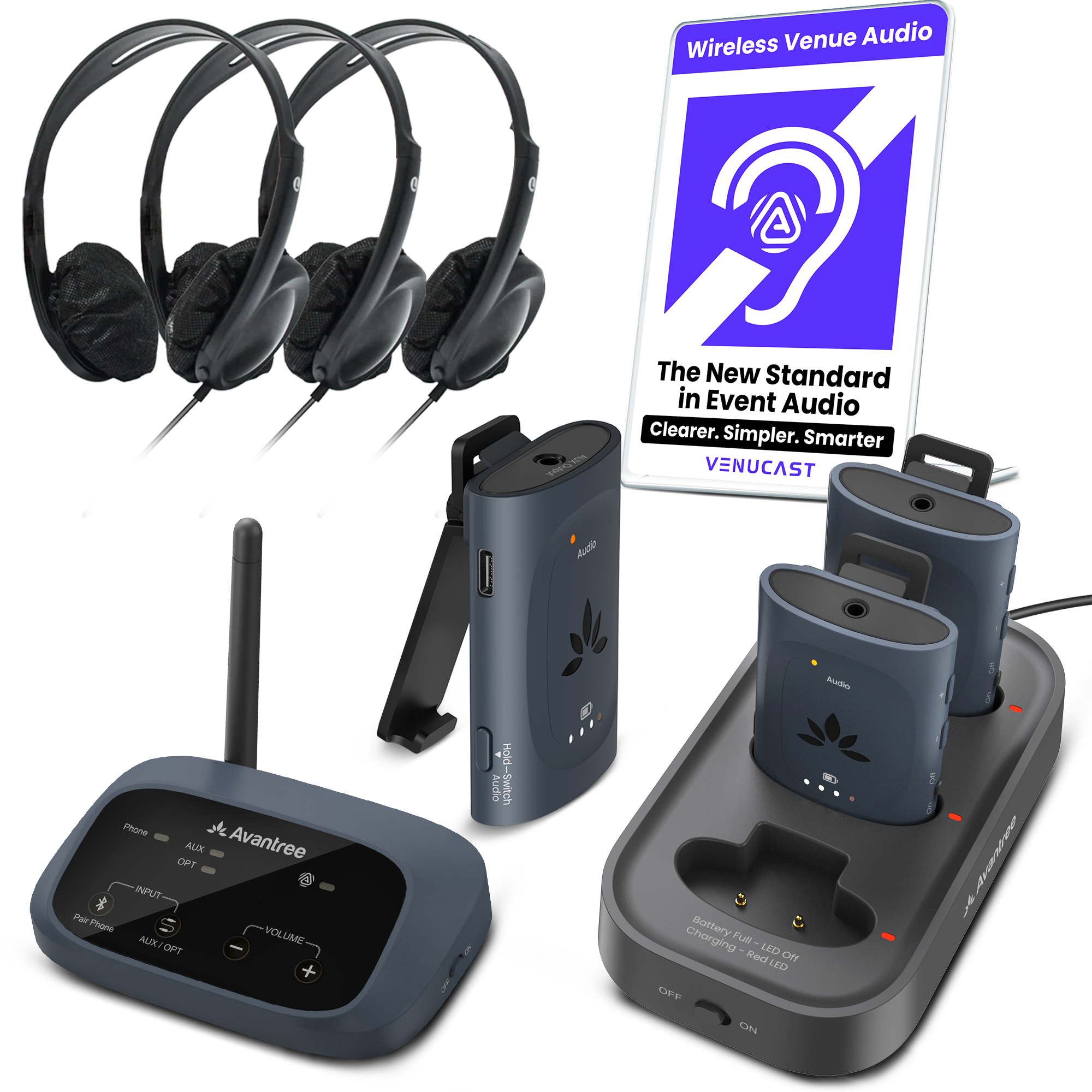 Auracast Assistive Listening System (1 Transmitter + 3 Receivers) with 3-Slot Charging Dock, One-to-Many Audio