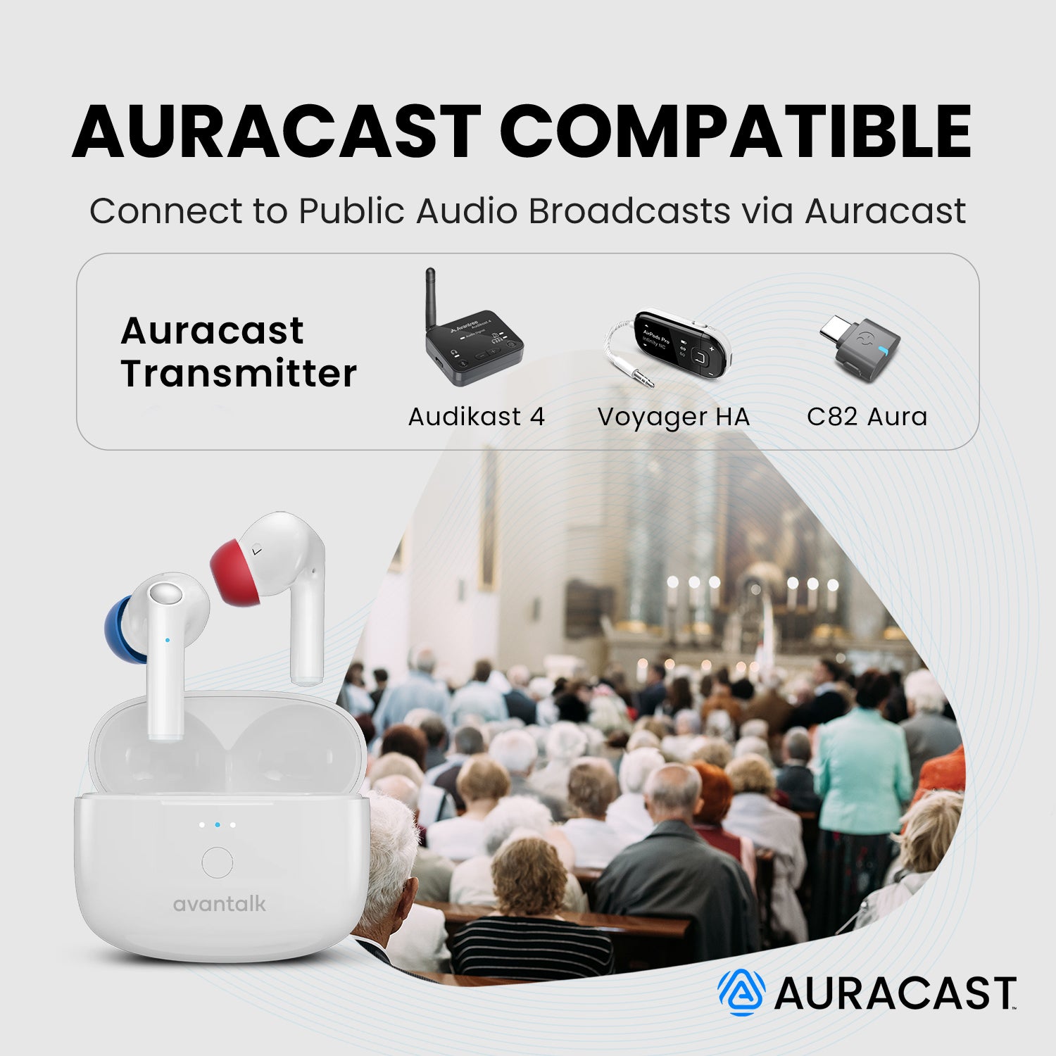Yes. They can pair directly with any Bluetooth-enabled TV. For perfect lip-sync, use a compatible low-latency transmitter — Auracast™ (Voyager, Audikast 4 series, Aura Focus base).