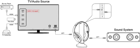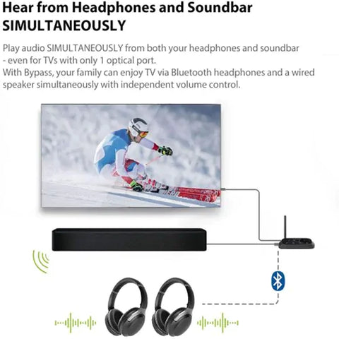 La nostra funzione "Passthrough" leader del settore ti consente di posizionare il trasmettitore/base tra una TV e un altoparlante esterno e di far uscire l'audio da entrambi i dispositivi ALLO STESSO TEMPO.