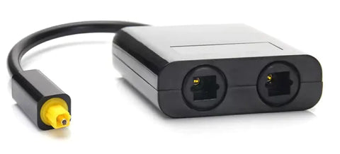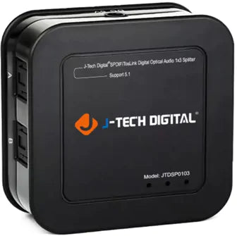 - Per AUDIO OUT ottico - Utilizzare uno splitter ottico (ad esempio splitter J-Tech) per condividere l'audio della TV tra un ALTOPARLANTE ESTERNO e il trasmettitore. Lo splitter in questo esempio è uno splitter audio ottico.