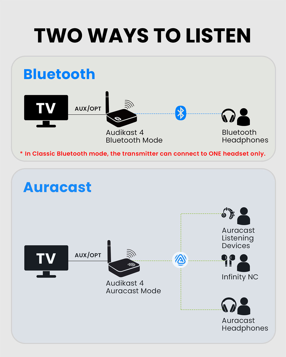 This transmitter supports the latest Auracast technology and is designed to stay compatible as Auracast devices continue to evolve. With firmware upgrade support, it's built for long-term use and future audio-sharing needs.
