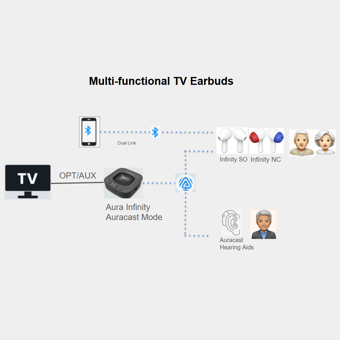 • Dual Link – Each earbud set maintains simultaneous connections to the Auracast Transmitter and your smartphone, ensuring you never miss a call.