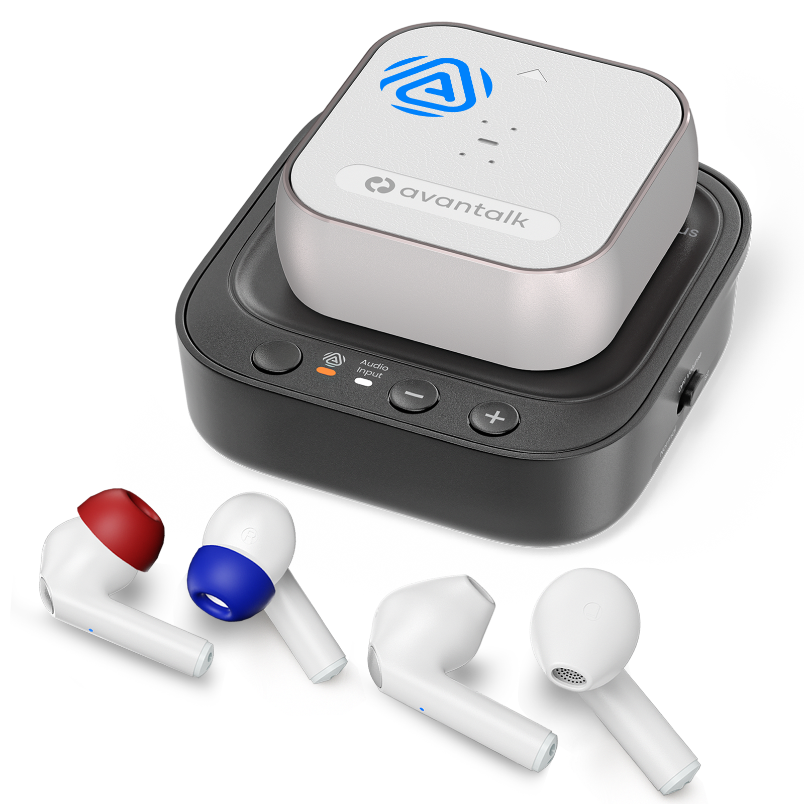 • 2-in-1 Base Station – The Aura Infinity acts as both the Auracast Transmitter and the compact, automatic Earbud Charging Dock.