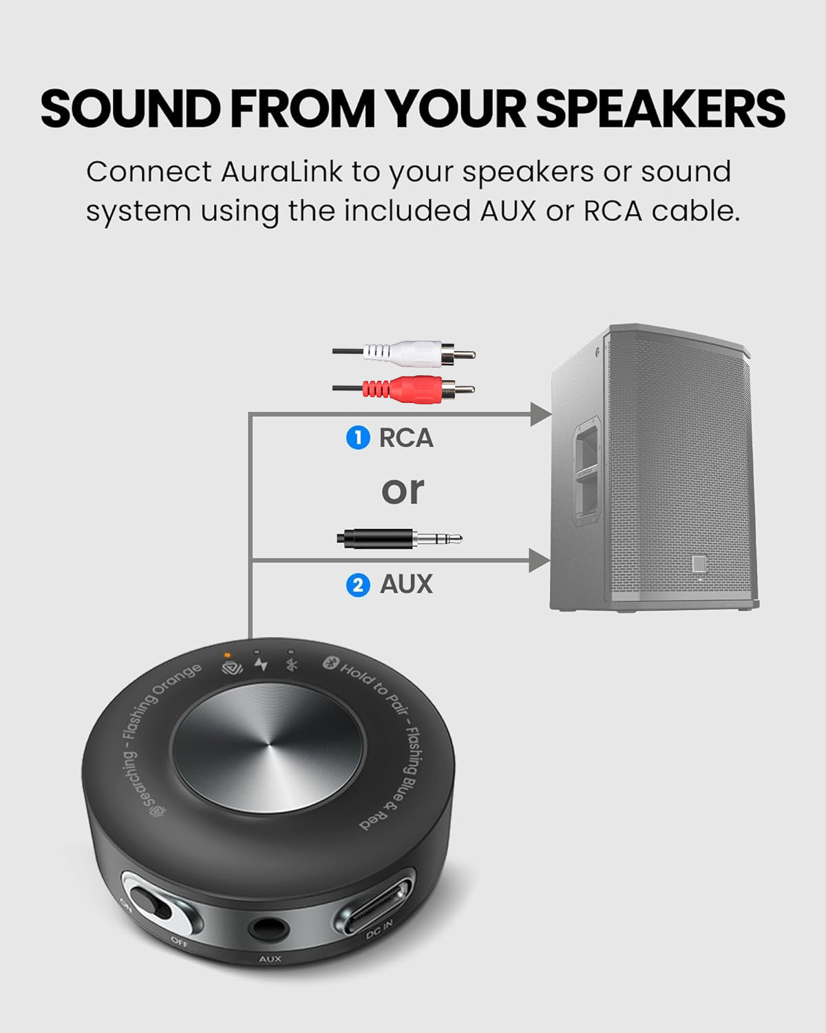 Auracast & Bluetooth 5.4 Audio Receiver with Qualcomm Chip, 20H Playtime, AUX Output, Multi-Speaker & Multi-Room Streaming