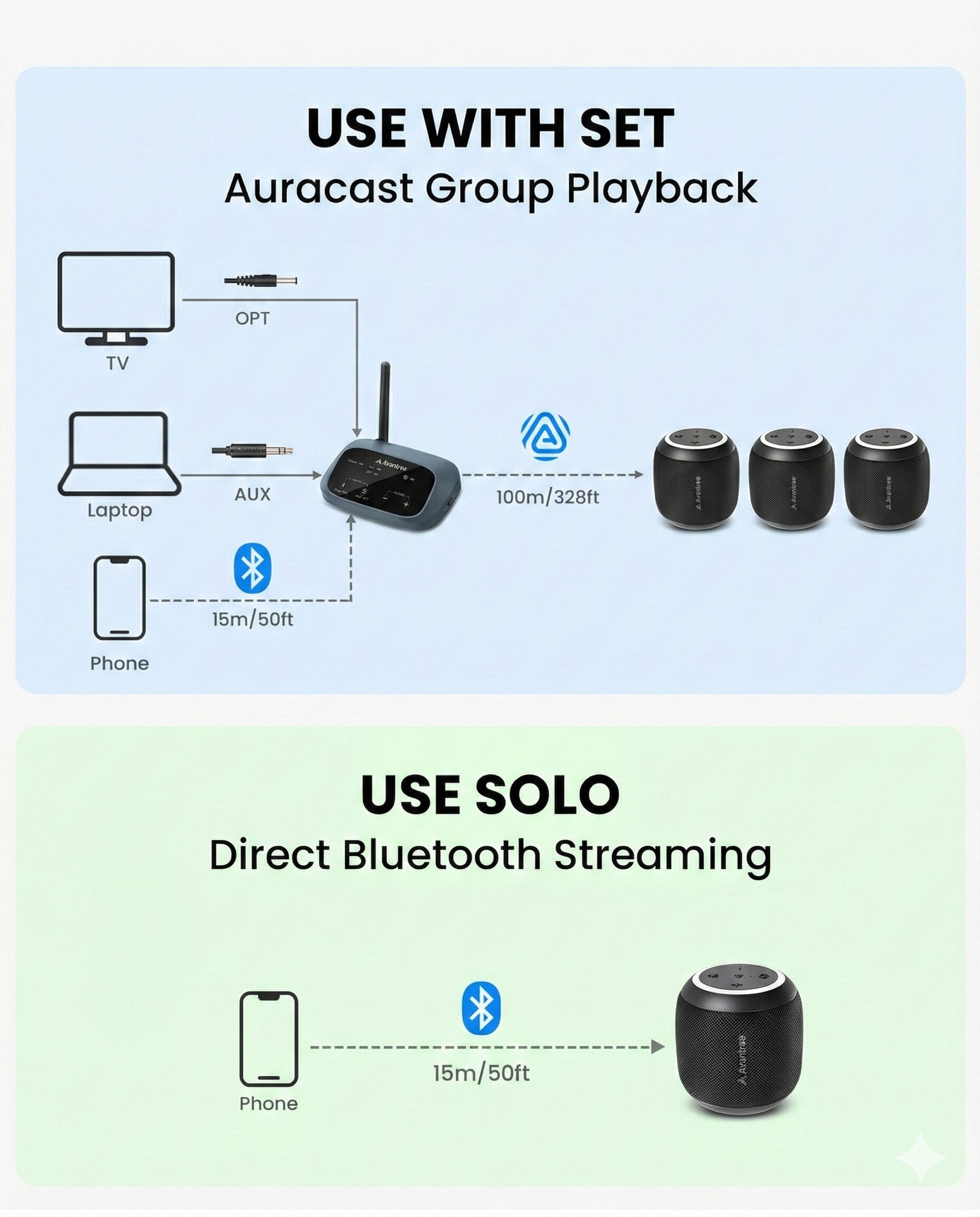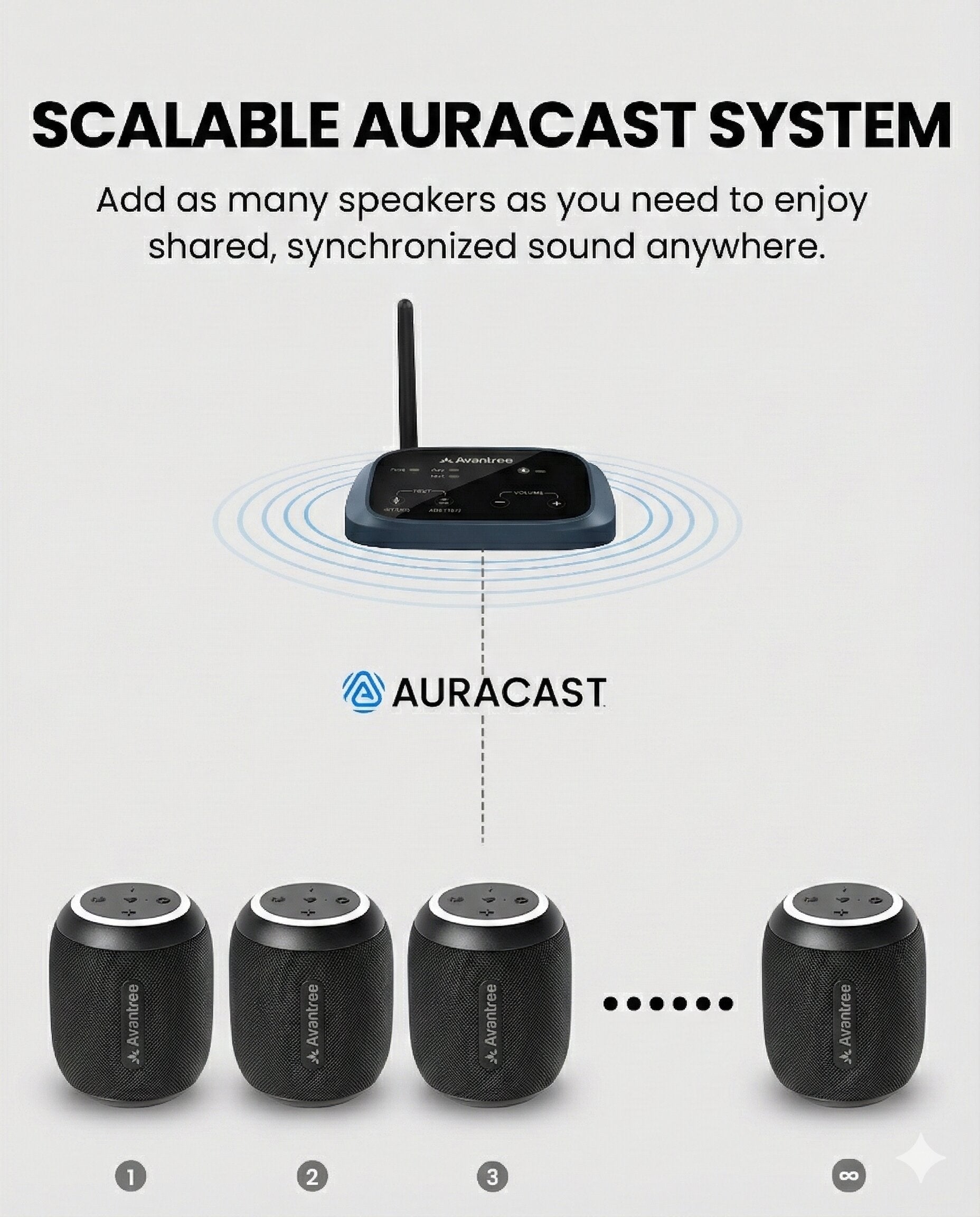 Auracast 5.4 Transmitter + 3 Sync Speakers, Optical/AUX/BT Inputs, 100m Range