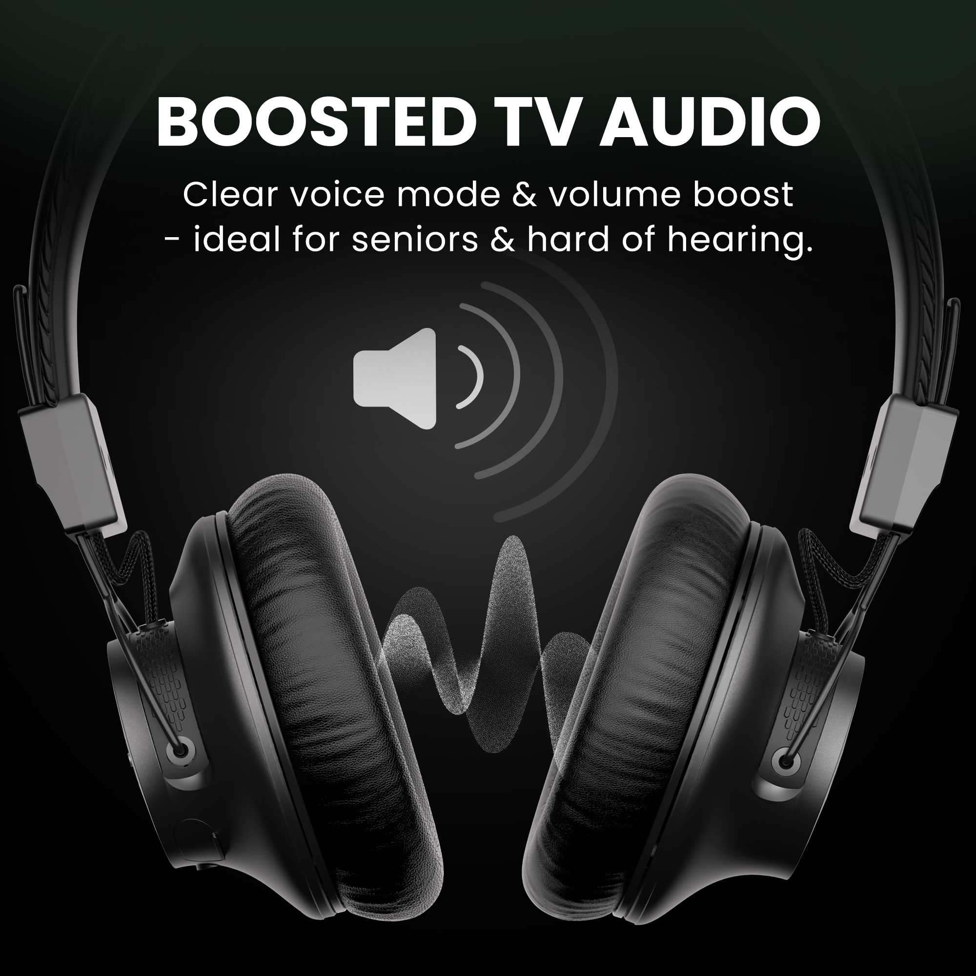 Struggling to hear dialogue? Switch on Clear Voice mode to make speech easier to follow. Use Volume Boost on the transmitter for sound that’s 15% louder than regular Bluetooth headphones. Ideal for seniors or users with mild to moderate hearing loss.
