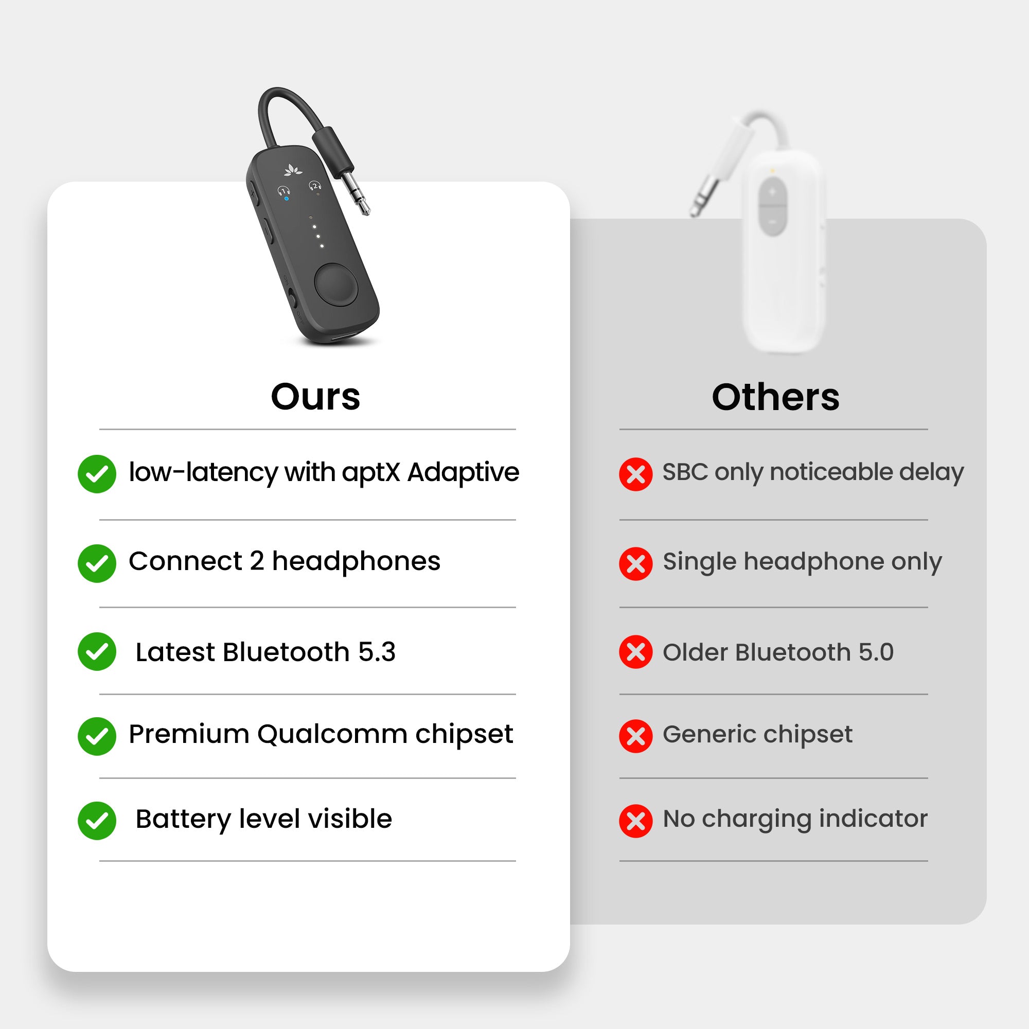 Airplane Use • Bluetooth 5.3 • Audio Adapter • Travel Essential • AirPods • Bose • Sony • Bluetooth Headphones • Flight • aptX Adaptive • Qualcomm Chip • 3.5mm AUX • Portable • Gym • 20 Hours Battery • Audio Sharing
