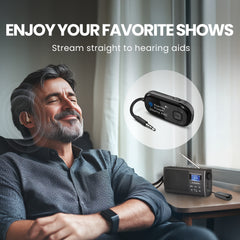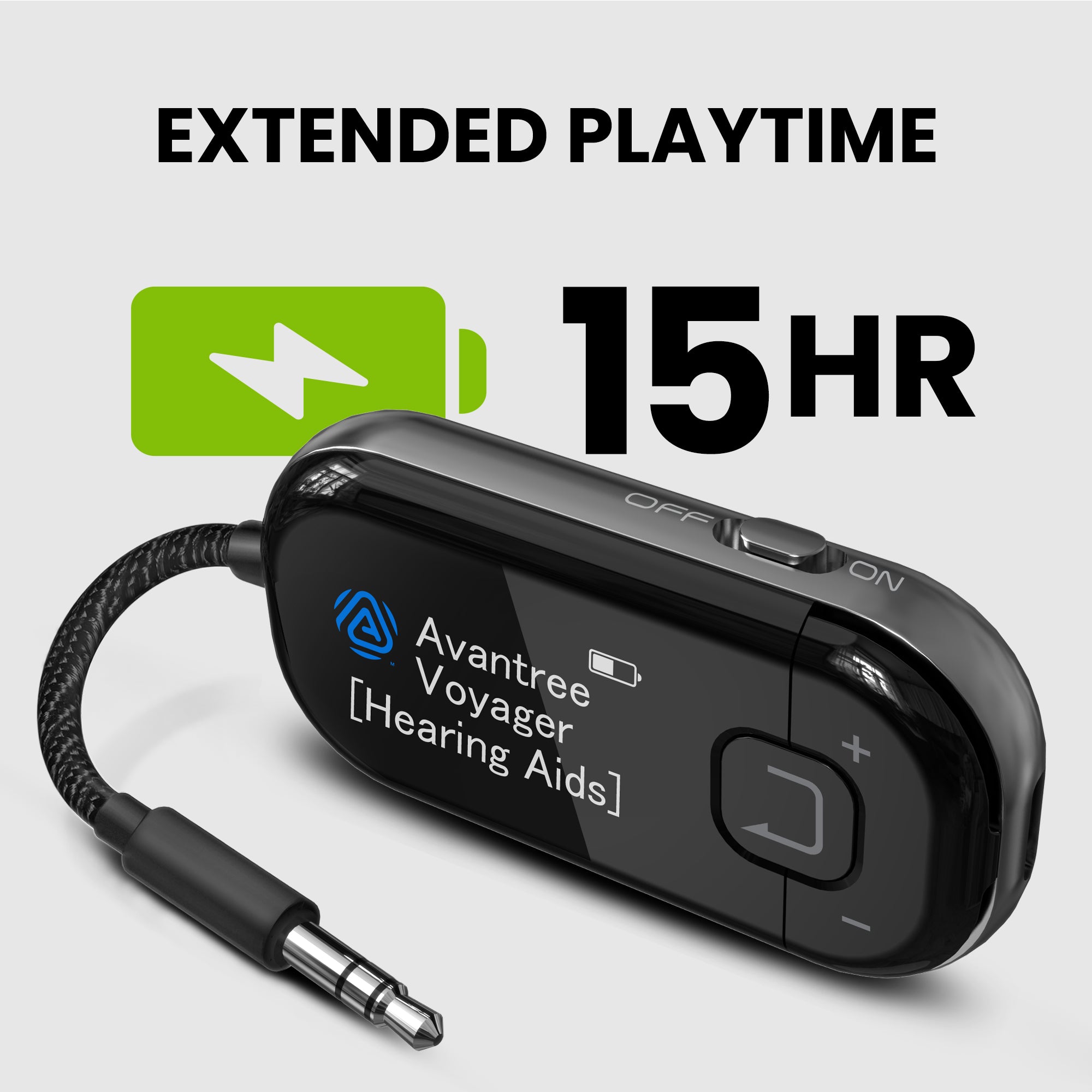Clear OLED screen shows status at a glance; works with airplane in-flight entertainment systems, PCs, radios, and treadmills via 3.5mm AUX. Also supports Bluetooth headphones as a backup when hearing aids are not worn.