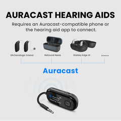 Streams audio via Auracast to supported hearing aids like ReSound, Jabra, Starkey, GN, and Beltone—offering a reliable, hearing-specific solution.