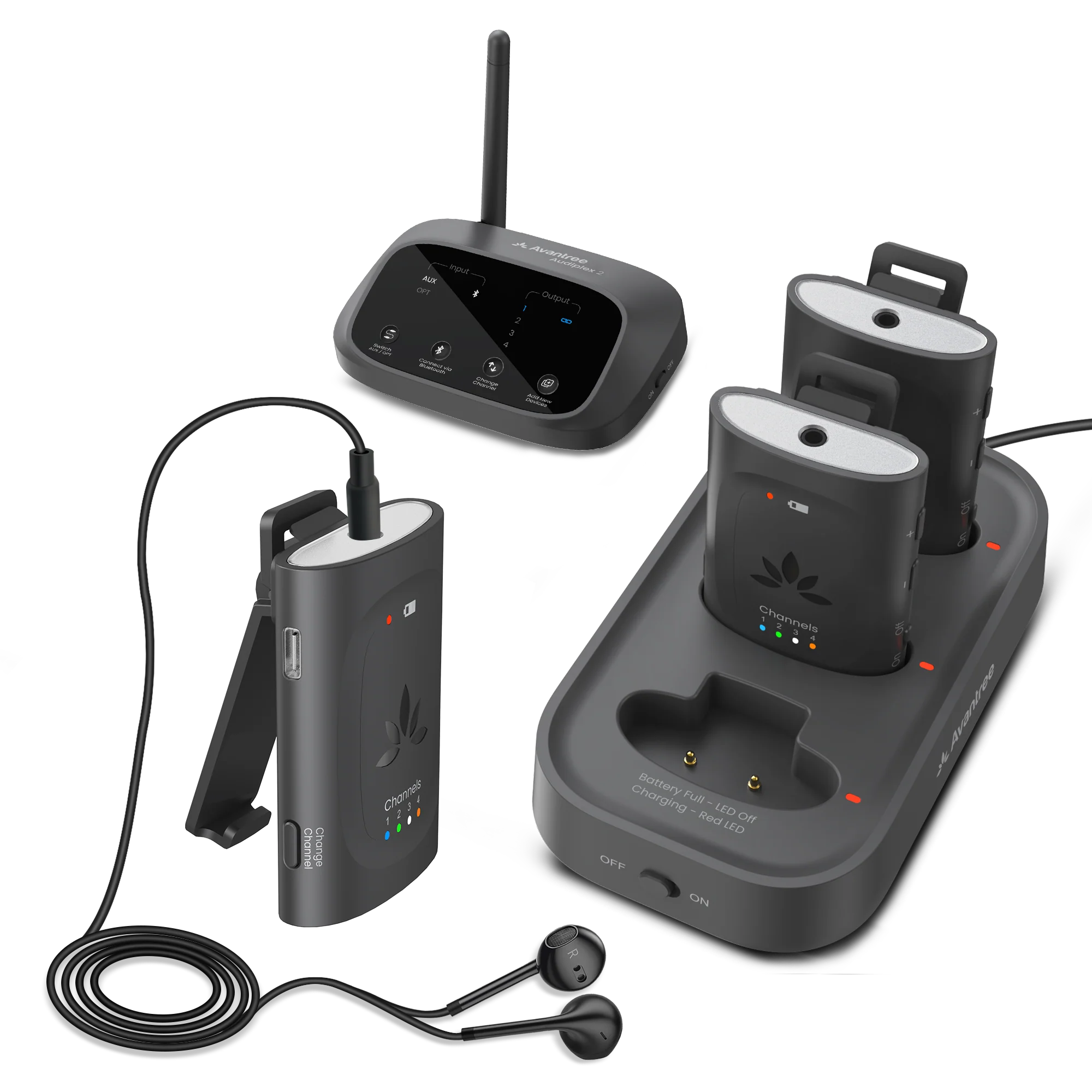 Connect your Audiplex transmitter to the audio source via either the OPT or AUX 3.5mm cable.