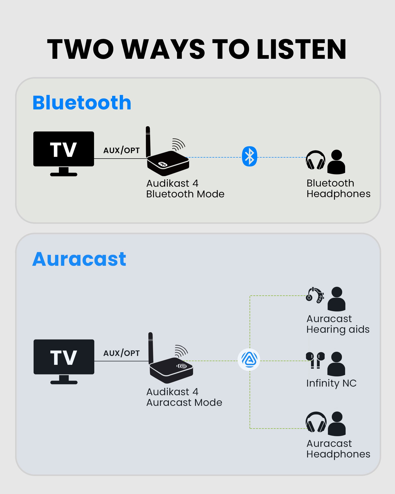 Auracast mode: No pairing required — just select the broadcast in your hearing aid app or compatible phone (Samsung S20+ or newer).