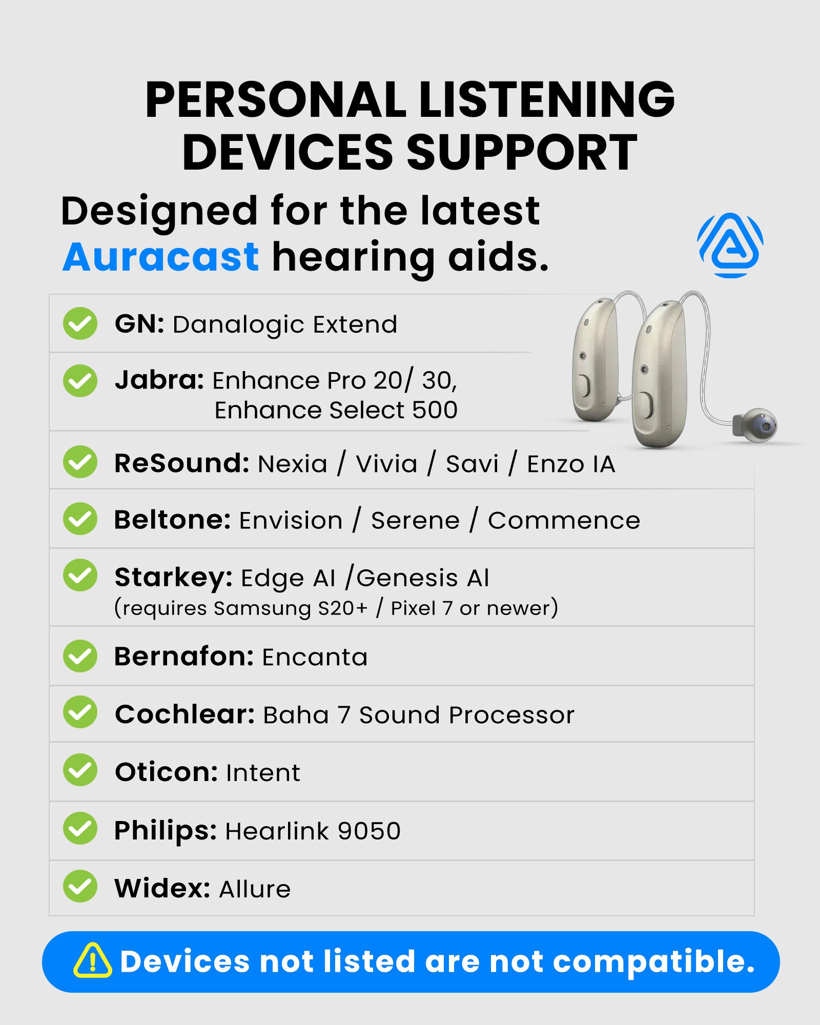 Yes—if your hearing aids support Auracast. Confirmed models include: GN Danalogic Extend, Jabra Enhance Pro 20/30 & Enhance Select 500, ReSound Nexia/Vivia/Savi, Beltone Envision/Serene, and Starkey Edge AI (with newer Android phones).