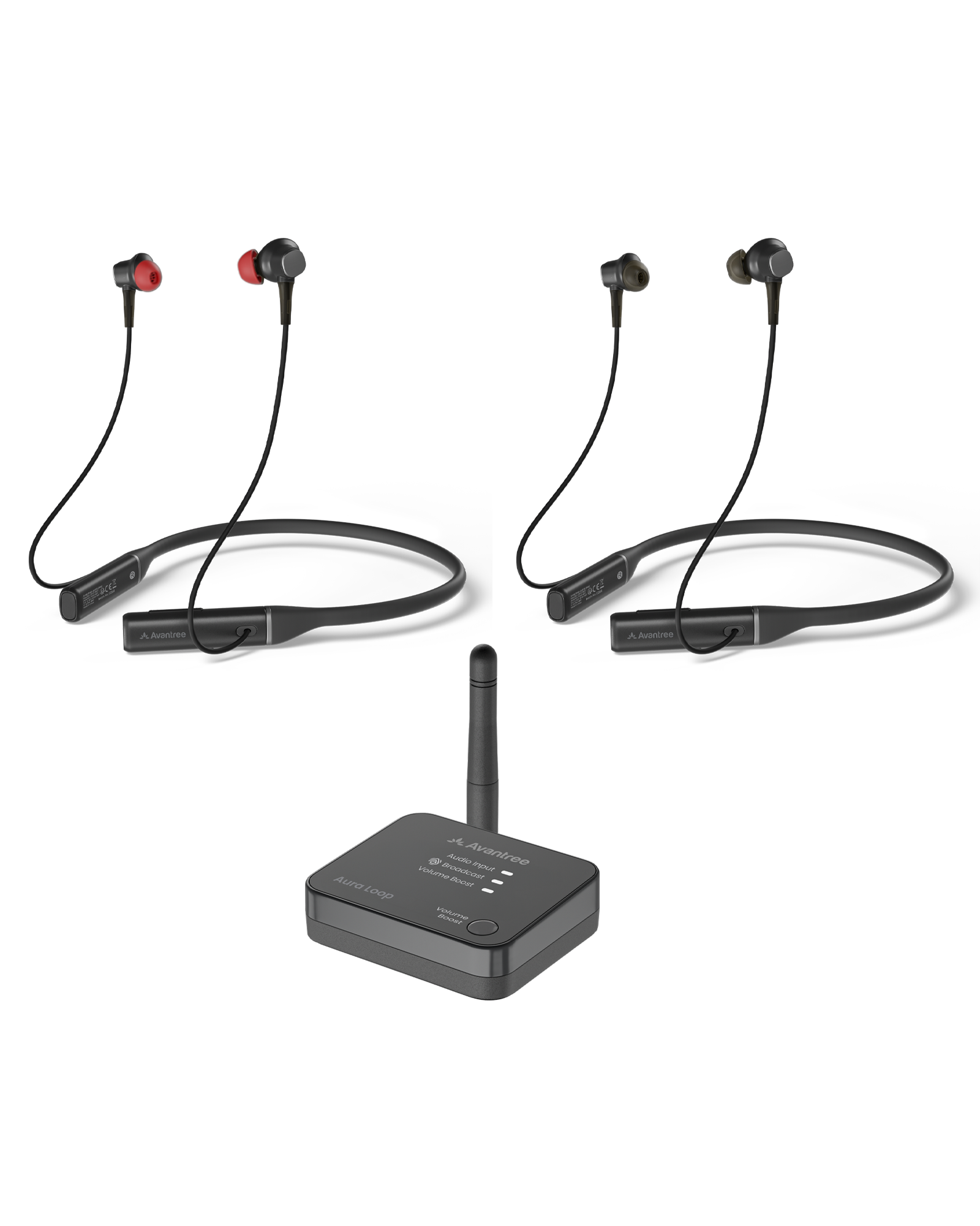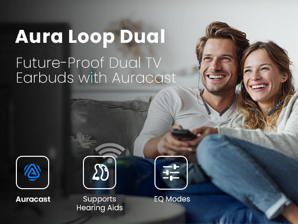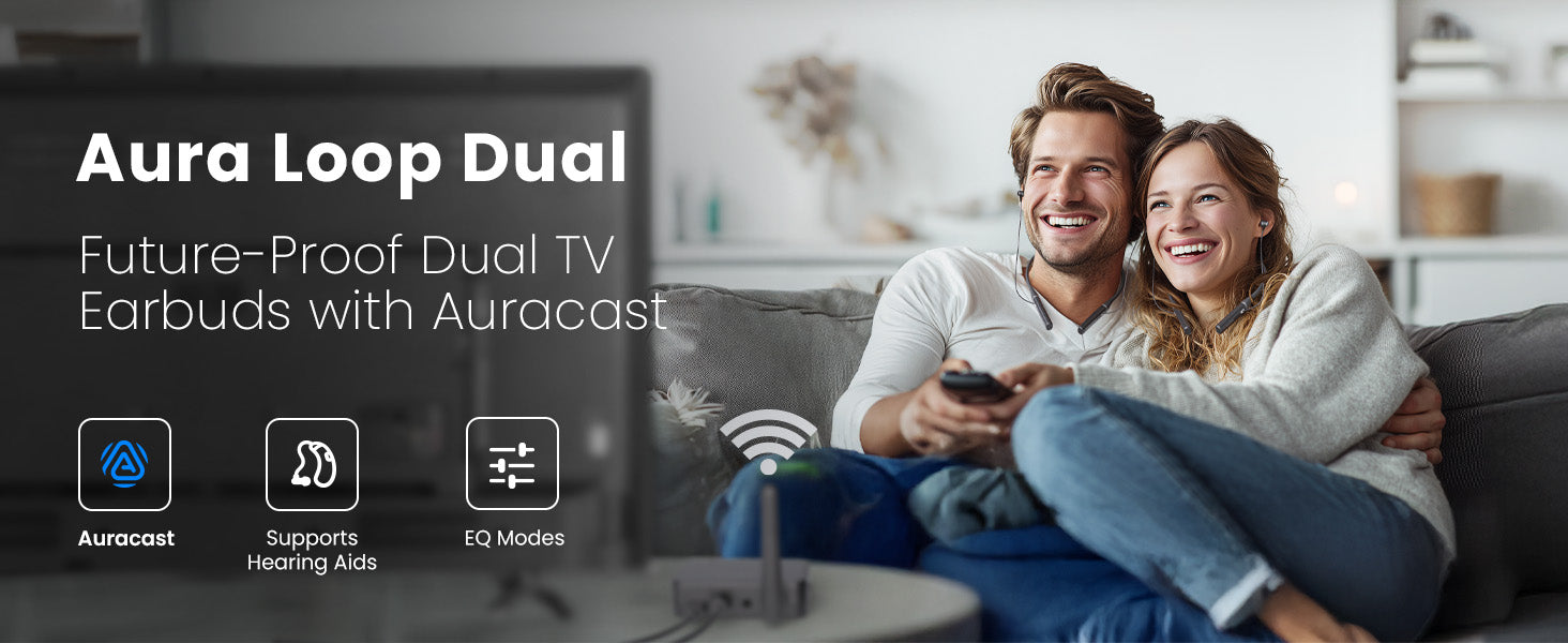 Aura Loop Dual features next-gen Bluetooth 5.4 with ultra-low latency, two ready-to-use earbuds, and Auracast sharing for multiple listeners.