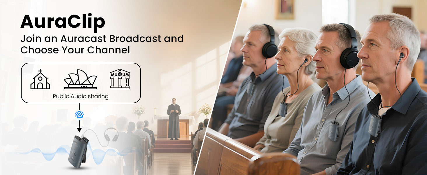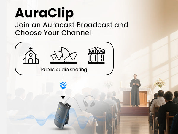 A: AuraClip can be used anywhere Auracast audio is available, including public venues, private events, classrooms, or with compatible Auracast transmitters at home.