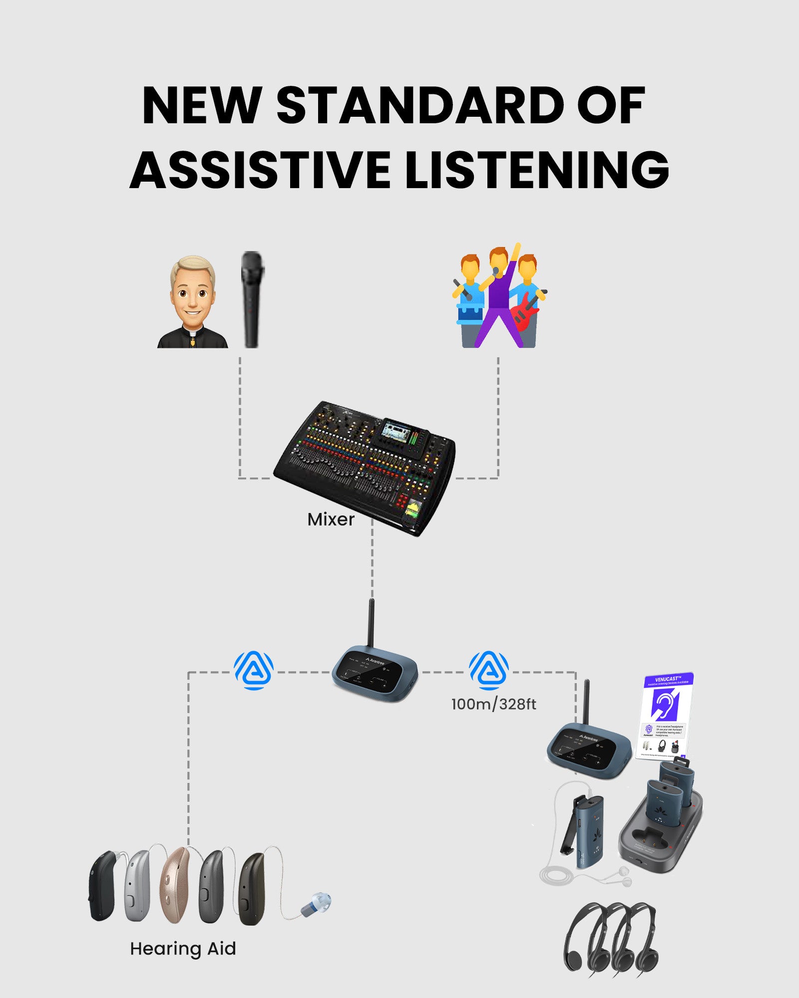 A: Yes. Users can listen using their own Auracast-compatible hearing aids or Auracast headphones without venue-managed pairing.