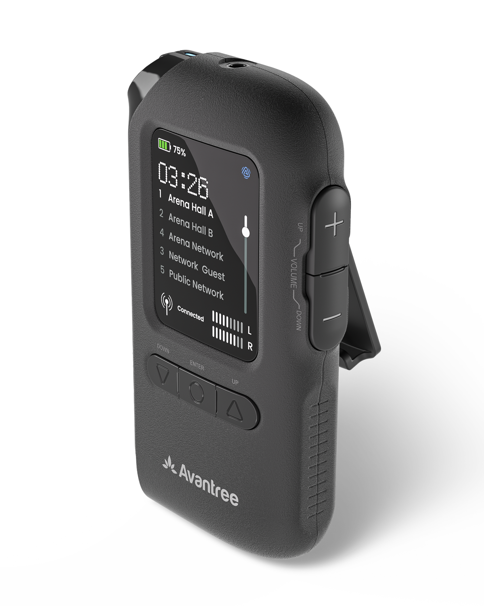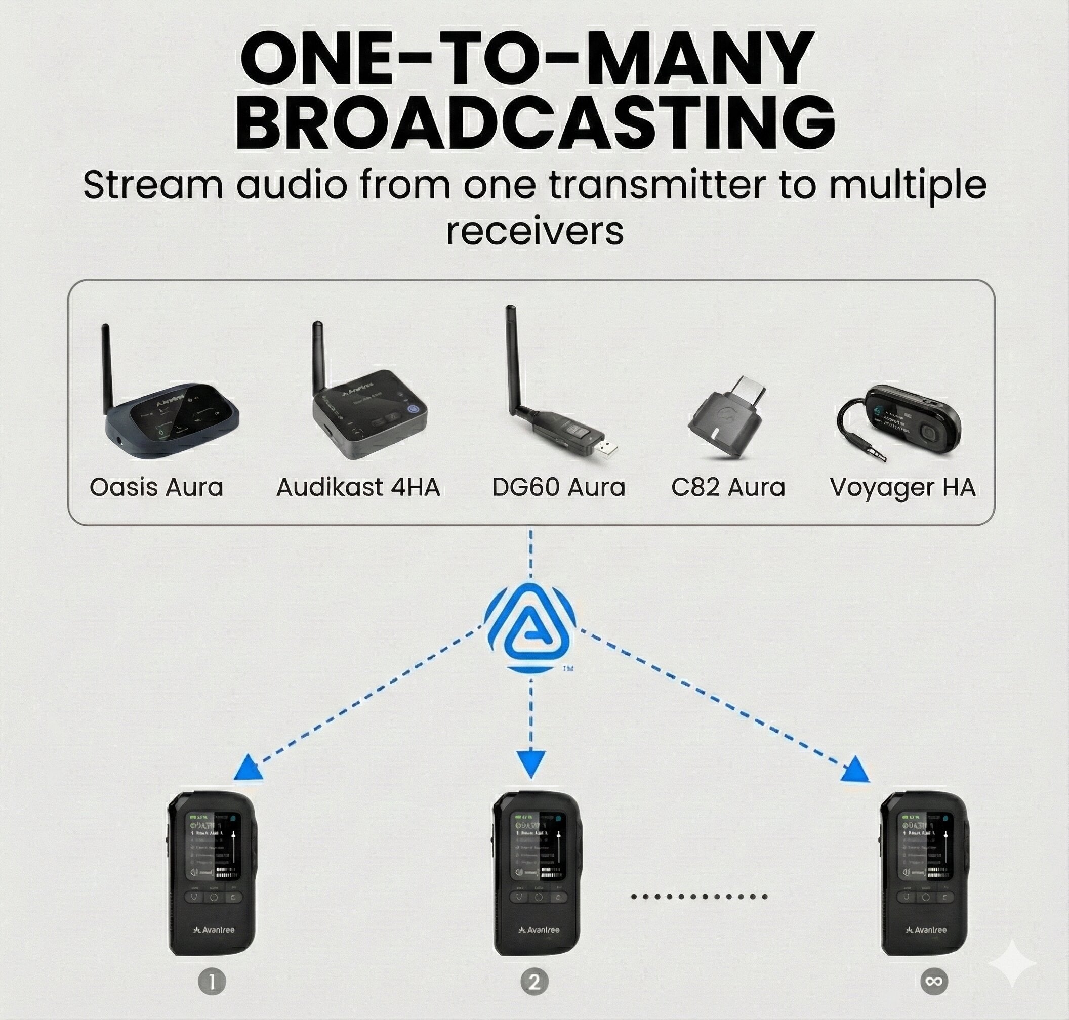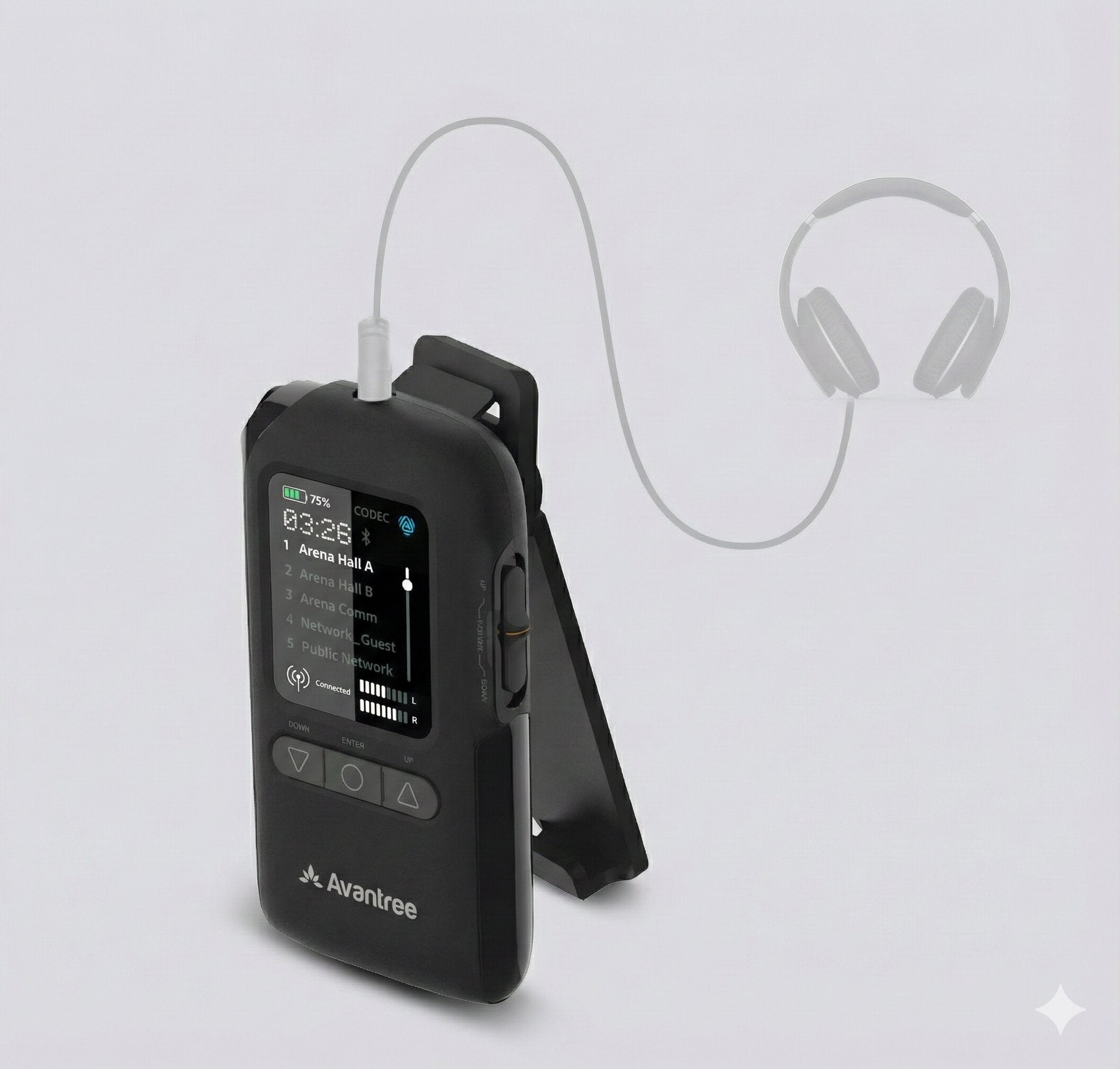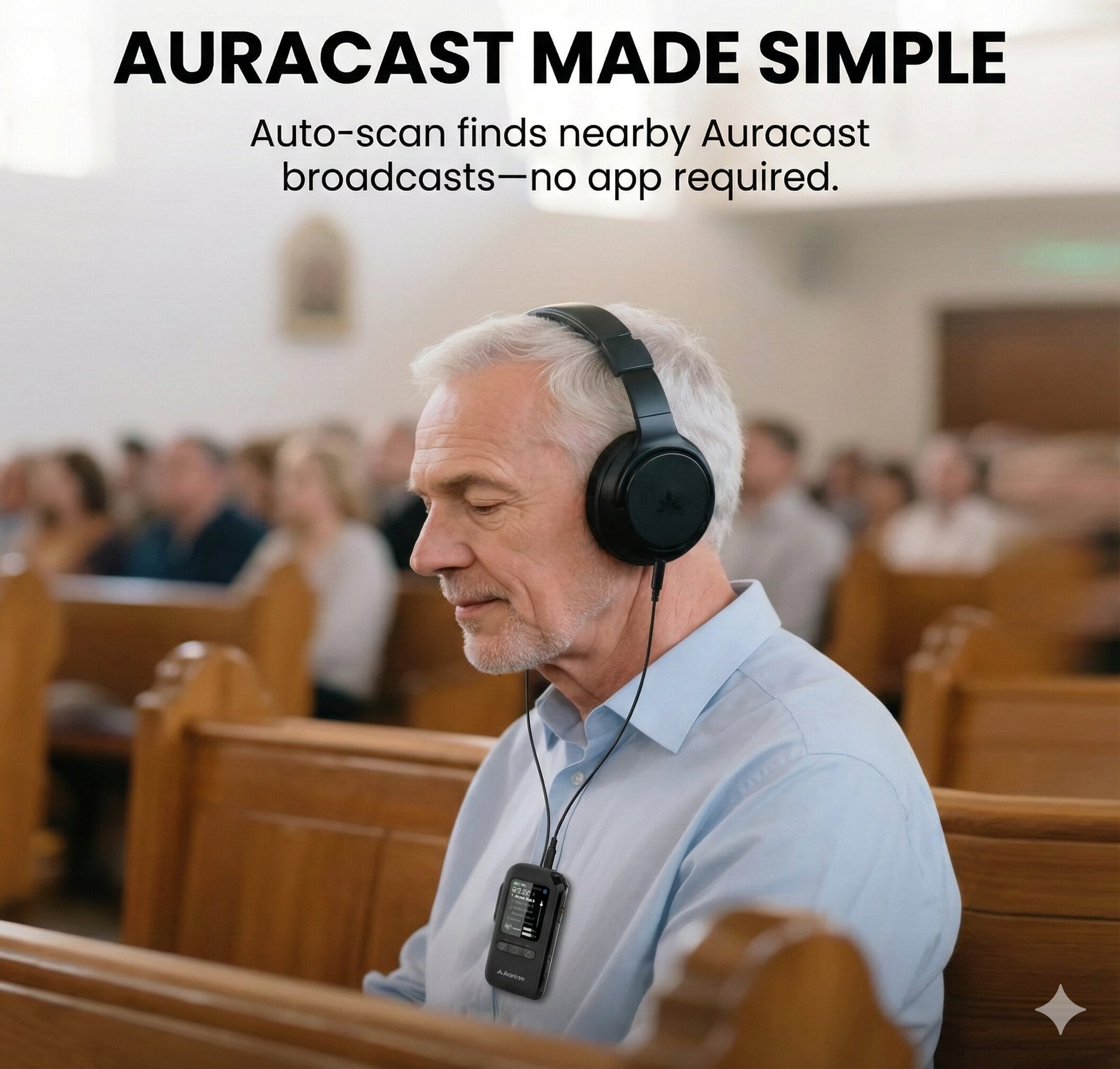 Auracast Bluetooth 5.4 Assistive Listening Receiver with OLED Screen for 3.5mm Headphones, Auto Scan
