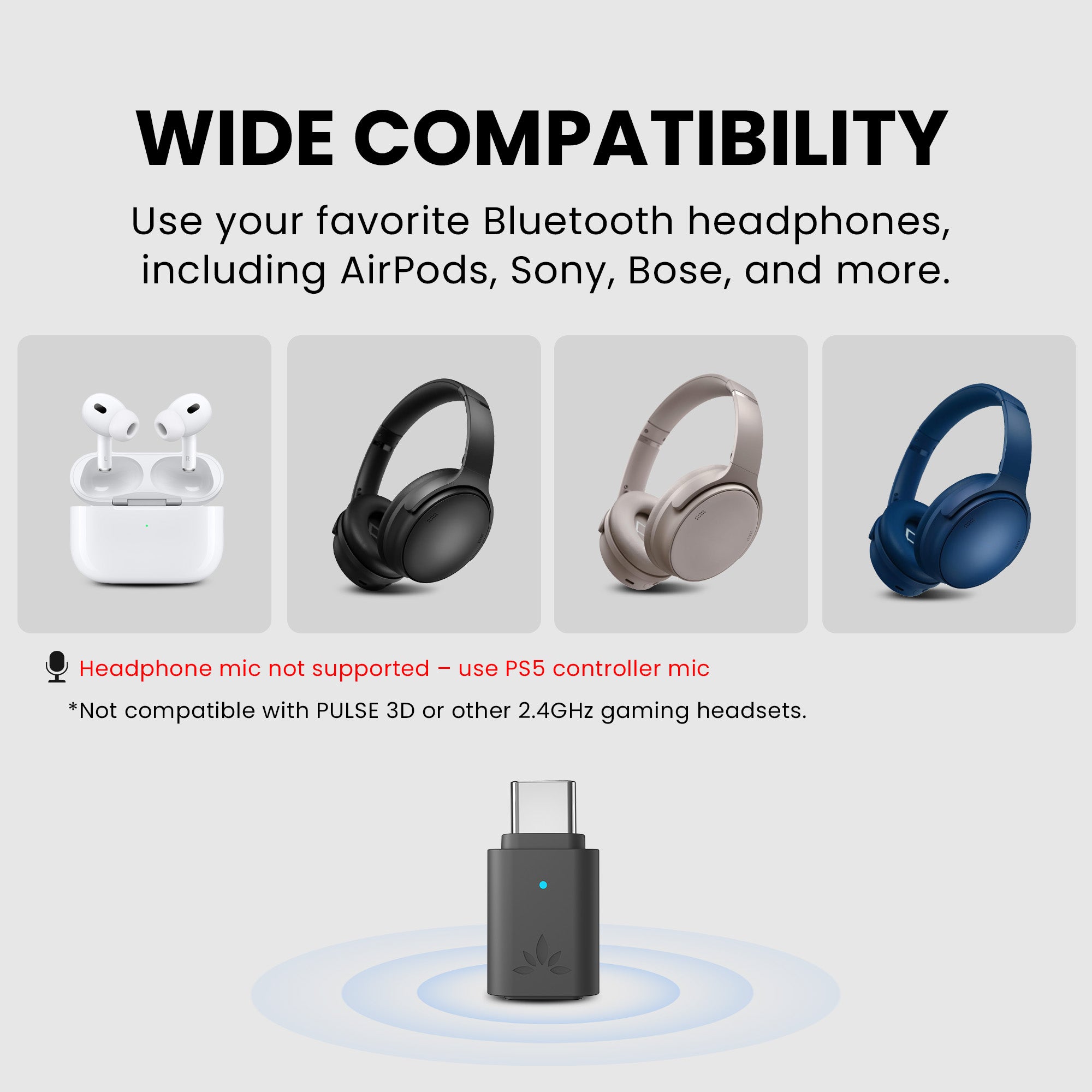 A: Yes, it works with most Bluetooth headphones and earbuds, including AirPods, Bose, and Sennheiser. However, it does NOT work with the PS5 PULSE 3D headset, PS Portal, or any 2.4GHz gaming headsets.