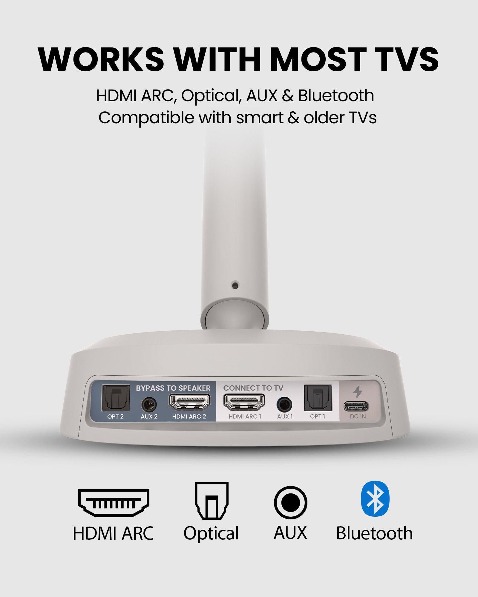 | TV Compatibility | All TVs with HDMI ARC, Optical, AUX |