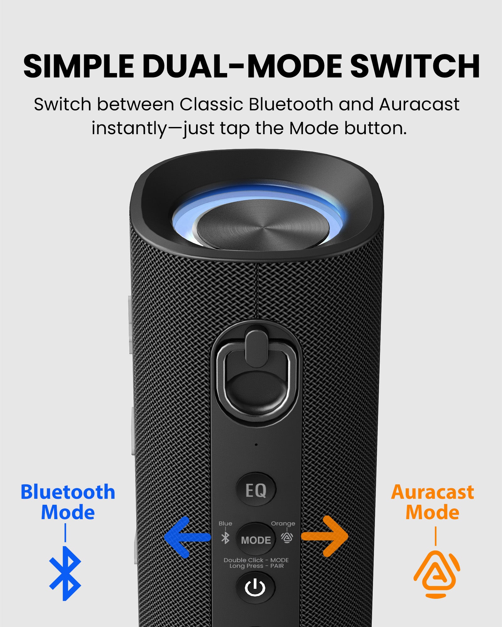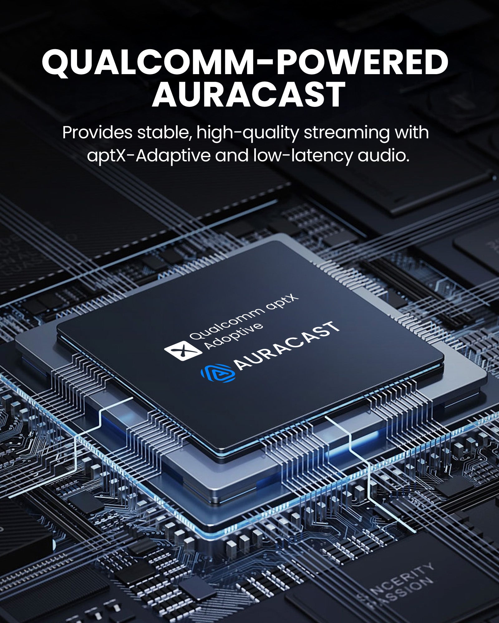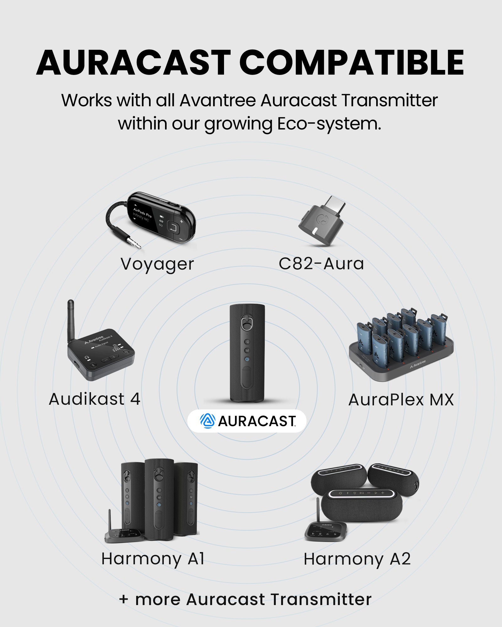 A: Auracast lets multiple speakers play the same sound at once. The Harmony A1 Solo works with the Harmony A1 or any open Auracast transmitter for group listening.