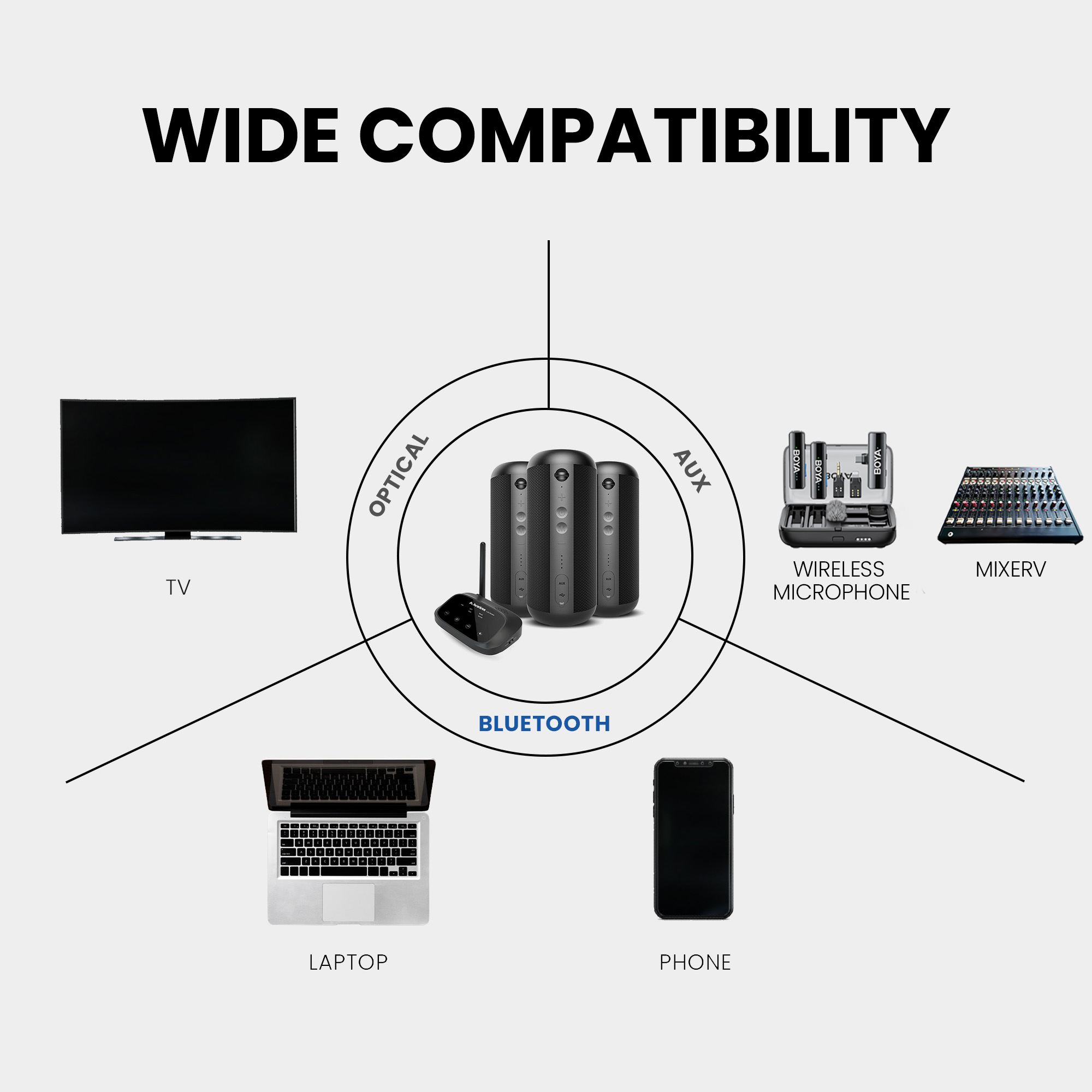 A: Most phones, TVs, tablets, and computers through Bluetooth, AUX, or Optical connection.