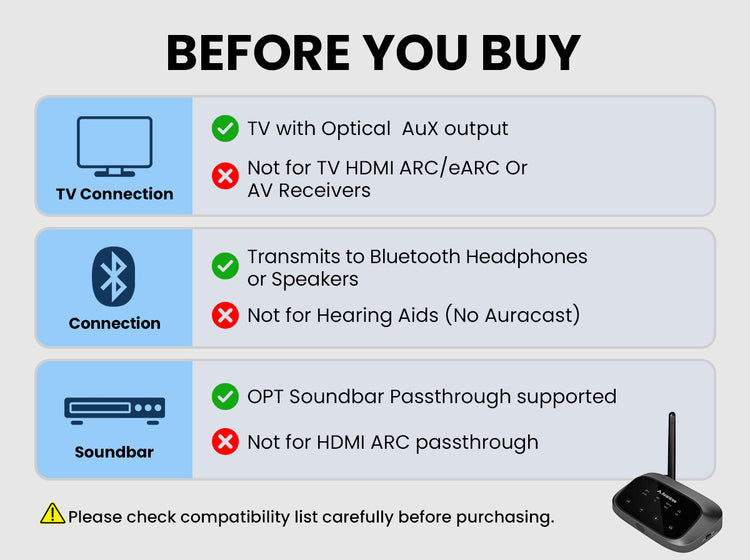 Avantree products are designed for versatility and broad compatibility. However, due to technical limitations, not all devices can work together. We strongly recommend checking compatibility before purchase.