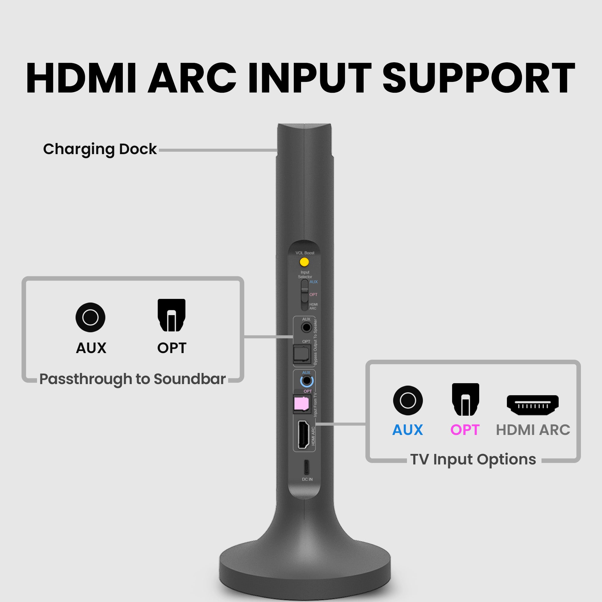 A: This product is compatible with TVs that have HDMI ARC, Optical (OPT), or AUX audio output. Please check your TV’s available audio ports and whether they are already in use before purchasing.