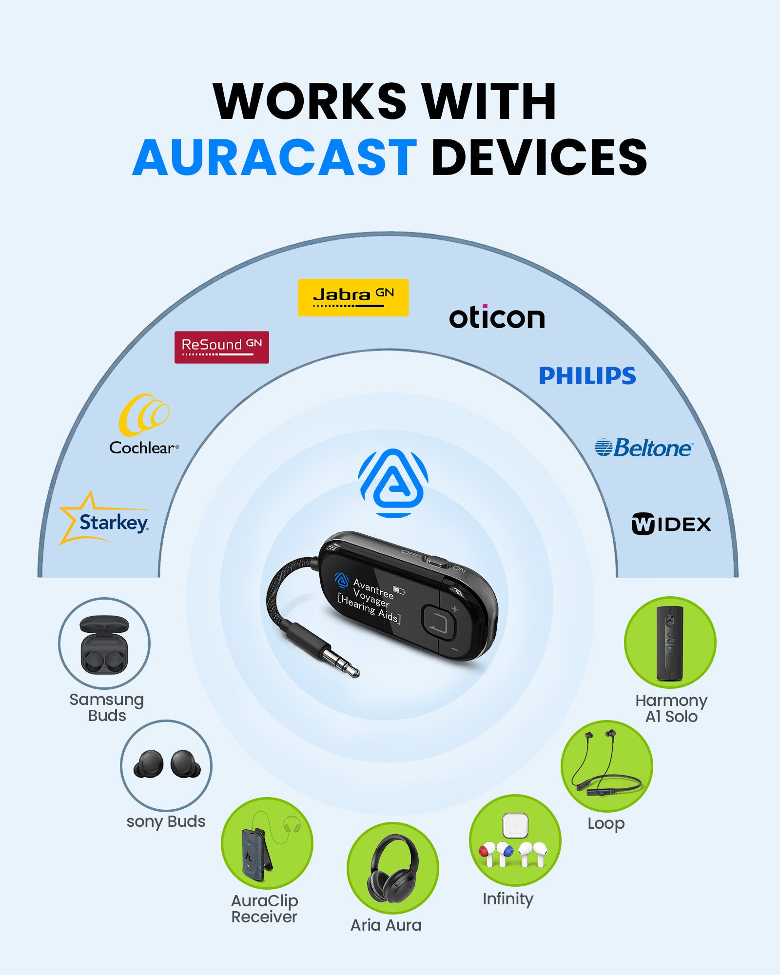 Voyager HA works with hearing aids that support either Auracast or Bluetooth. Please confirm your device’s compatibility before purchasing - Auracast is recommended for best performance.